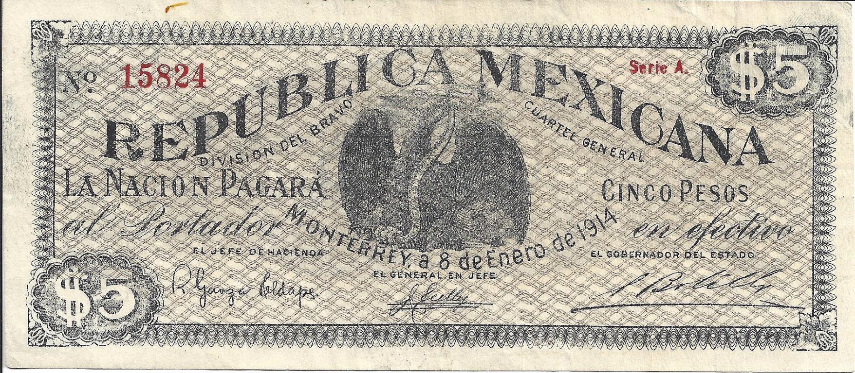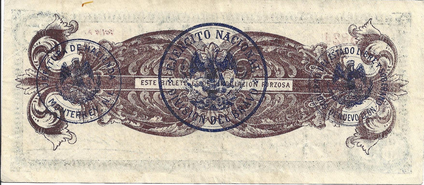 DESCRIPCIÓN ADICIONAL: reverso con 3 resellos, Jefatura de Hacienda, Monterrey, División del Bravo y Estado de Nuevo León, no mencionado en el catálogo para esta denominación