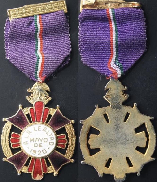 DESCRIPCIÓN ADICIONAL: G. D430 --- Cruz a la Lealtad 1920, AU con partes del esmalte desprendido, otorgada durante el gobierno de Venustiano Carranza, con listón original y asa, en bronce, de 10 cm de largo y 4 de ancho, escasa