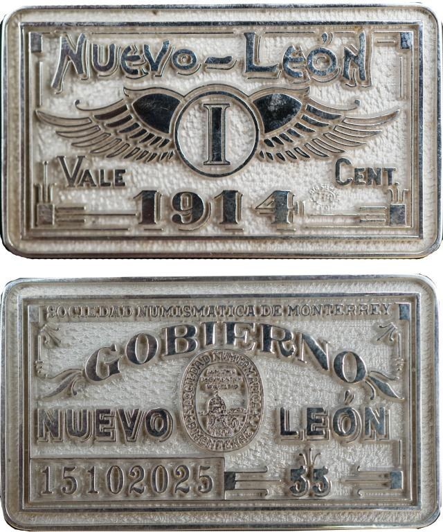 DESCRIPCIÓN ADICIONAL: Medalla 55 aniversario Sociedad Numismática de Monterrey 2025, UNC, plata 0.925, acuñada por Richer, 51 gramos, 55x32 mm, espesor de 4.2mm, acabado mate con relieves terminado proof, emisión limitada a 55 piezas. Diseño inspirado en un conocido bilimbique emitido en Monterrey en 1914, para venta exclusiva de los socios, el único ejemplar destinado al público, con precioso estuche color negro y certificado, muy escasa