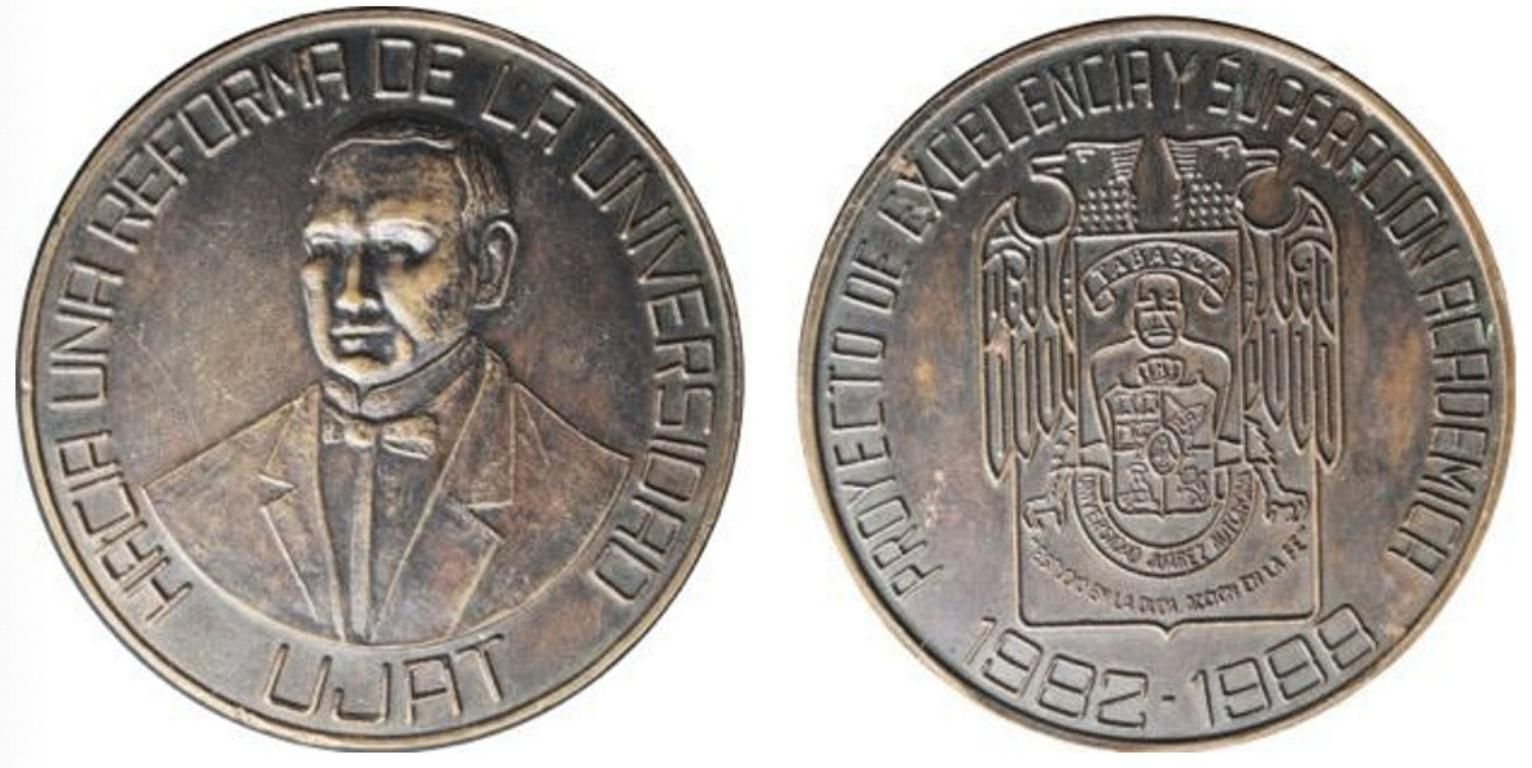 DESCRIPCIÓN ADICIONAL: Universidad Juárez Autónoma de Tabasco 1988, conmemoración de Benito Juárez, AU con canto dañado, cobre, gran diámetro de 76mm, grosor de 6mm de diámetro, imagen en tamaño reducido, muy escasa
